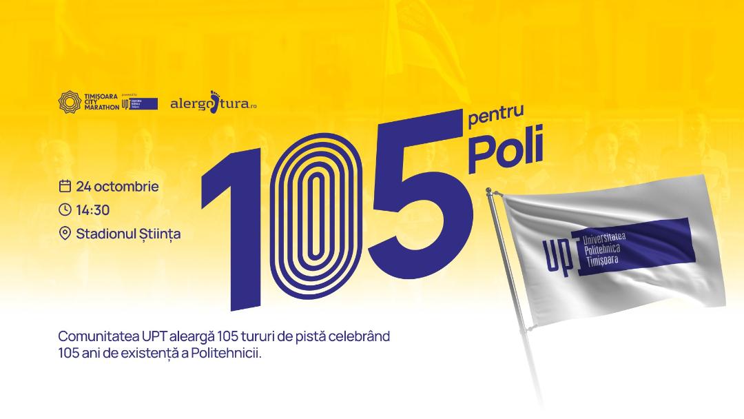 Universitatea Politehnica Timișoara, în parteneriat cu Asociația sportivă Alergotura, invită întreaga comunitate academică, partenerii și prietenii instituției să participe, vineri, 24 octombrie 2025, pe Stadionul „Știința”, la un eveniment cu o semnificație specială – „105 pentru Poli”, tradiționala cursă de alergare prin care celebrăm, în mișcare, cei 105 ani de la înființarea Politehnicii timișorene.