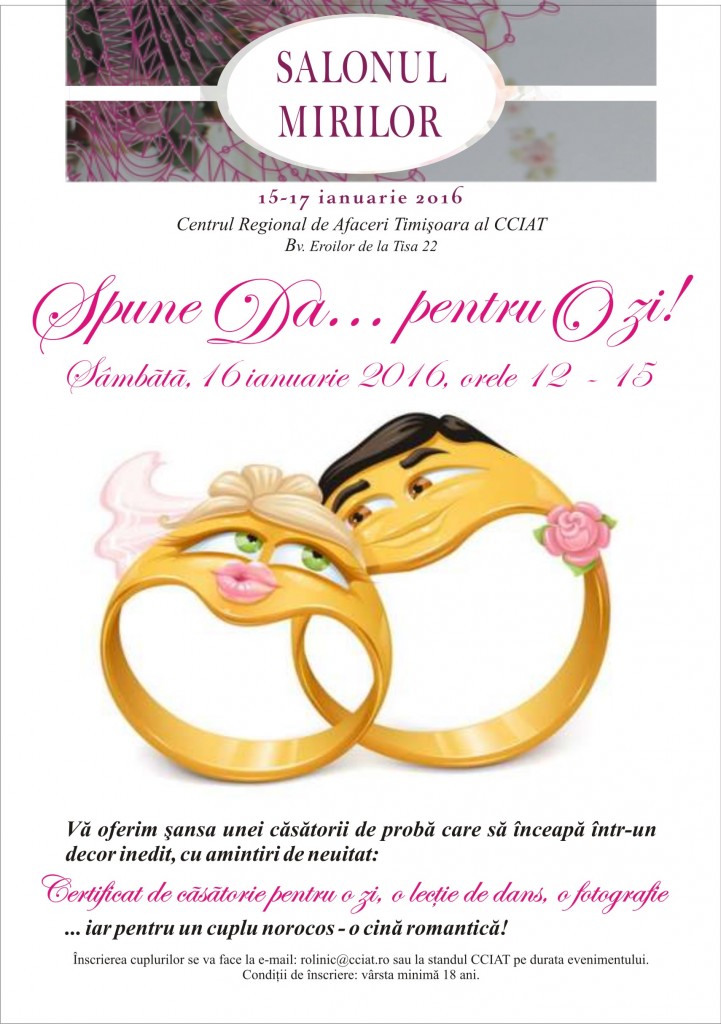 Șansa unei căsătorii de probă va fi oferită tinerilor cupluri, sâmbătă, 16 ianuarie 2016, între orele 12.00-15.00, la „Spune DA pentru o zi”, ziua în care cuplurile „proaspăt căsătorite” vor primi o fotografie, o lecție de dans și vor intra în tombola care le va aduce o cină romantică.