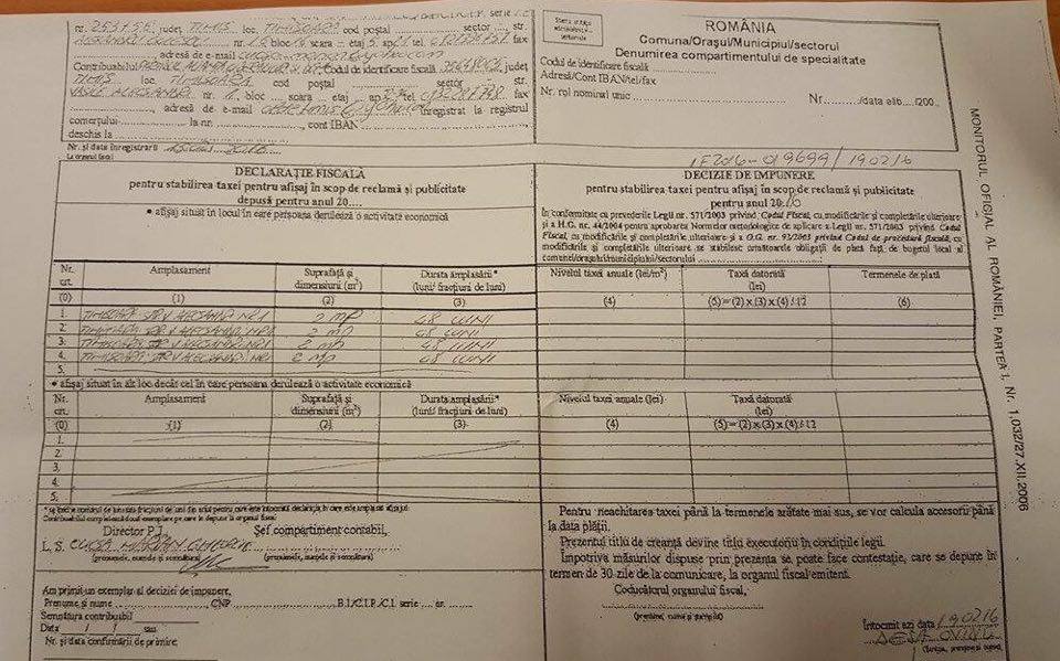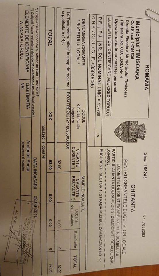 Reamintim, ALDE Timiș a inaugurat de curând o bibliotecă în Piața Libertății, în clădirea primăriei vechi. Pentru a putea semnaliza biblioteca, partidul a depus o cerere de amplasare a unei imagini publicitare la Direcțiea Fiscală și a primit o decizie de impunere pentru suma de 100 de lei pe an cu permisiunea de a lipi afișul pe fereastră.