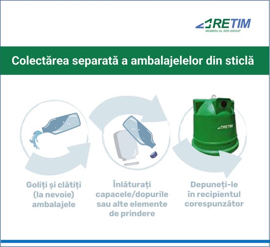 Pentru colectarea ambalajelor și recipientelor de sticlă, în vederea reciclării este suficient să le depuneți în recipientul de culoare verde.