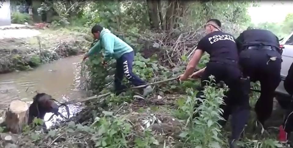 Polițiștii locali, cu ajutorul a două persoane aflate în zonă, au reușit scoaterea animalului din apa care îi ajungea până la piept, fiind practic imobilizat.
