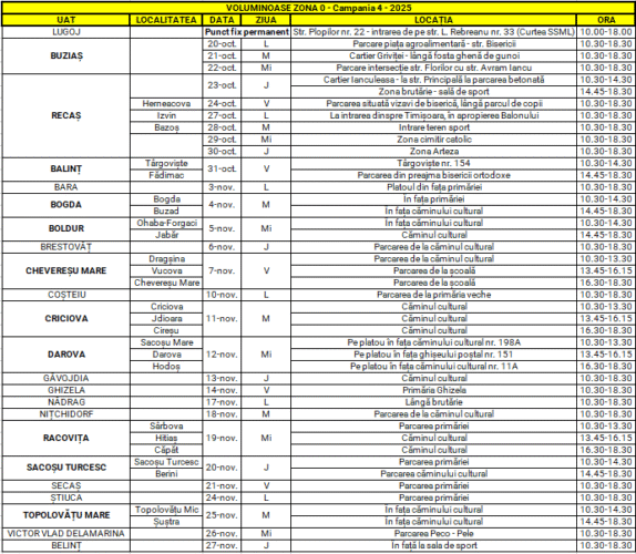 În perioada 20 octombrie – 27 noiembrie 2025, în Zona 0 Ghizela, județul Timiș, locuitorii din Lugoj (un singur punct fix), Buziaș, Recaș (și în Herneacova, Izvin și Bazoș), Balinț (Târgoviște și Fădimac), Bara, Bogda (și în Buzad), Boldur (Ohaba – Forgaci și Jabăr), Brestovăț, Chevereșu Mare (și în Dragșina și Vucova), Coșteiu, Criciova (și în Jdioara și Cireșu), Darova (și în Sacoșu Mare și Hodoș), Găvojdia, Ghizela, Nădrag, Nițchidorf, Racovița (Sârbova, Hitiaș și Căpăt), Sacoșu Turcesc (și în Berini), Secaș, Știuca, Topolovățu Mare (Topolovățu Mic și Șuștra), Victor Vlad Delamarina și Belinț au ocazia să le predea legal și gratuit la containerele RETIM!