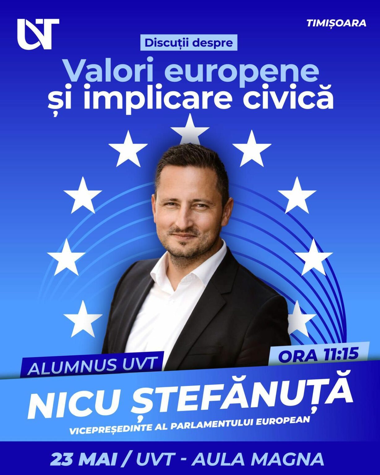 Universitatea de Vest din Timișoara vă invită să luați parte la un dialog esențial despre prezentul și viitorul societății europene, alături de invitatul special, europarlamentarul Nicu Ștefănuță, vicepreședinte al Parlamentului European și alumnus UVT, care va afla la UVT în cadrul conferinței „Valori europene și implicare civică”.