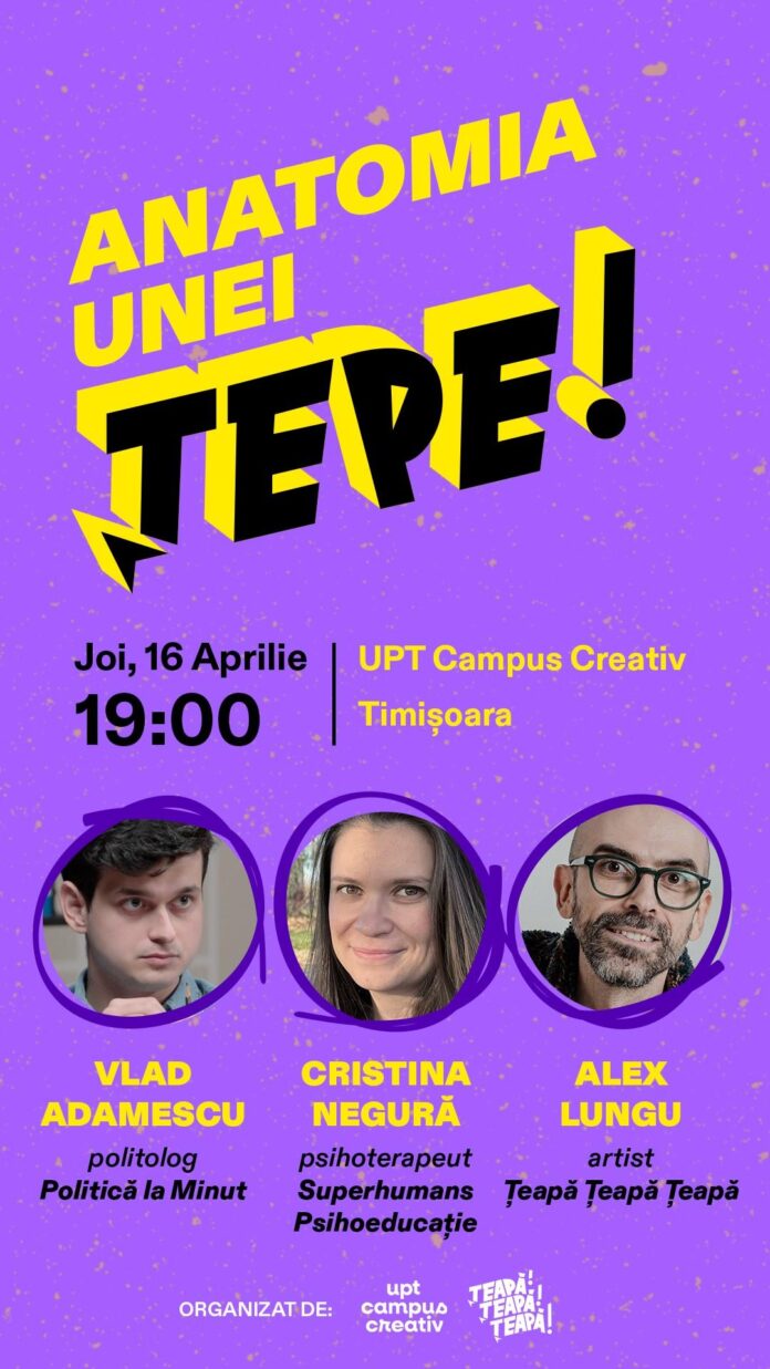 Timișorenii sunt așteptați la această dezbatere pentru a extinde dialogul și a înțelege mai bine interiorul unei țepe, alături de invitați speciali. O conversație deschisă despre anatomia unei țepe și despre mecanismele subtile și bine calculate care ne exploatează.