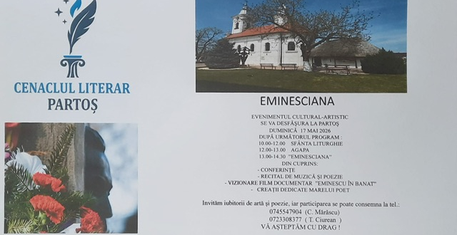 Eveniment de suflet, pentru suflete! Cenaclul Literar „Partoș” organizează duminică, 17 mai, evenimentul cultural-artistic „Eminesciana”, o manifestare devenită tradiție și dedicată poetului național, Mihai Eminescu.