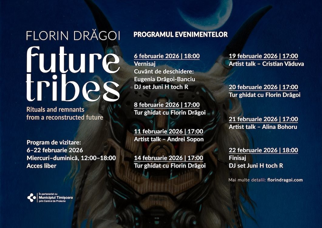 „Triburi Viitoare – ritualuri și fragmente dintr-un viitor reconstruit” prezintă o serie de desene de Florin Drăgoi care construiesc o mitologie speculativă a unei lumi modelate de colaps și regenerare. În acest viitor imaginat, umanitatea nu dispare, ci se reorganizează în triburi hibride, profund conectate cu natura, purtând în același timp urmele tehnologiei, memoriei și cunoașterii acumulate.