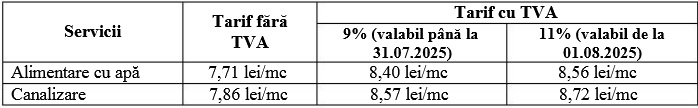 Ca urmare a modicării art. 291 din Codul Fiscal prin art. II din Legea nr. 141/25.07.2025, privind unele măsuri fiscal-bugetare și prevederile art. VII din aceeași lege, tarifele cu TVA, valabile de la 1 august 2025, vor fi după cum urmează: