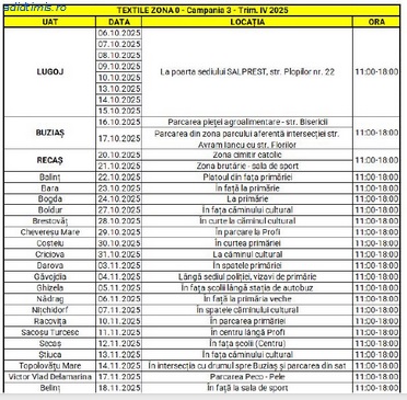 Utilizatorii casnici din localitățile menționate pot preda gratuit, prin aport voluntar, deșeurile textile la punctele de colectare stabilite, conform programului din tabelul de mai jos: