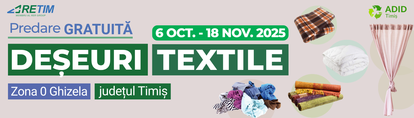 ADID Timiș anunță începerea campaniei trimestriale pentru predarea gratuită a deșeurilor textile, organizată împreună cu RETIM Ecologic Service S.A., în Zona 0 Ghizela, jud. Timiș din 2025. În perioada 06 octombrie – 18 noiembrie utilizatorii casnici din localitățile: Lugoj, Buziaș, Recaș, Balinț, Bara, Bogda, Boldur, Brestovăț, Chevereșu Mare, Coșteiu, Criciova, Darova, Găvojdia, Ghizela, Nădrag, Nițchidorf, Racovița, Sacoșu Turcesc, Secaș, Știuca, Topolovățu Mare, Victor Vlad Delamarina și Belinț, pot beneficia de această oportunitate pentru a se debarasa legal și GRATUIT de deșeurile textile din gospodărie.