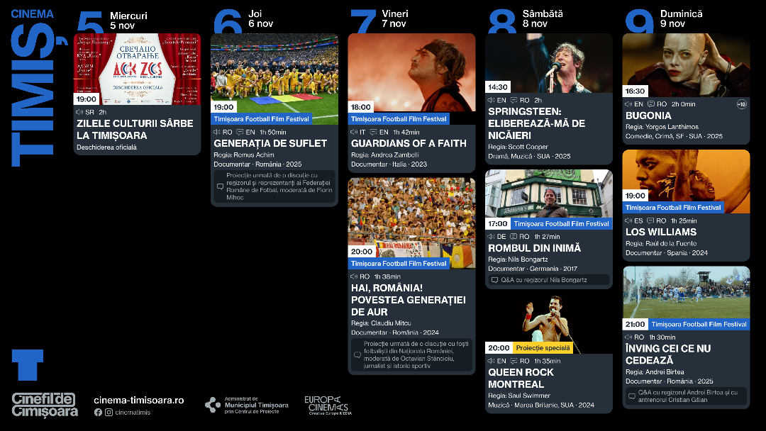 Începem luna noiembrie cu un program vast, pentru toată lumea. Timișoara găzduiește prima ediție a Fotbal Film Festival cu o mulțime de filme urmate de discuții cu invitați, Cinemateca Itinerantă, Film Therapy, Concert Queen pe ecran, discuții aprinse despre revoluție dar și multe premiere și filme bune care merită să fie văzute în sala de cinema.