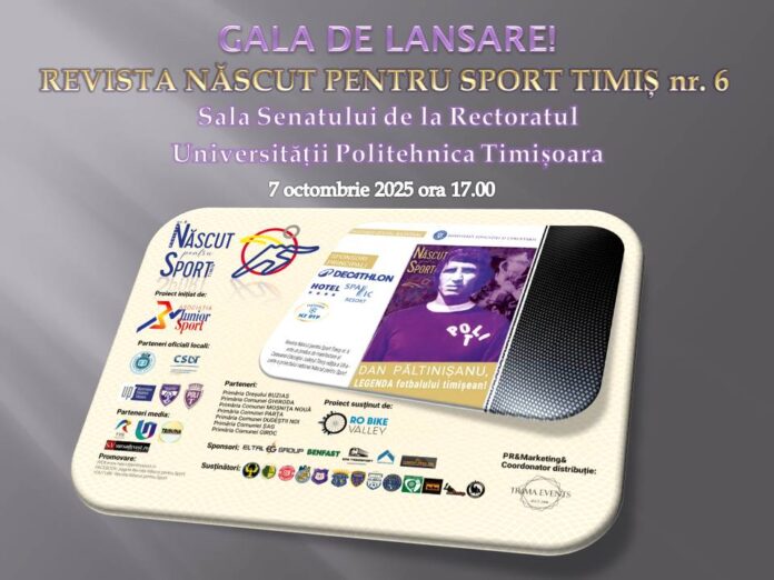 Pe data de 7 octombrie, de la ora 17.00, la Sala Senatului de la Rectoratul Universității Politehnica Timișoara, va avea loc gala de lansare pentru Revista Născut pentru Sport Timiș nr. 6 – produs de manifestare al Caravanei Educației în județul Timiș – parte a proiectului național Născut pentru Sport, proiect inițiat, în urmă cu 14 ani, de Asociația Junior Sport, pentru care, de 10 ani, Ministerul Educației este partener oficial național, iar de 6 ani, Inspectoratul Școlar Județean Timiș este partener oficial local.
