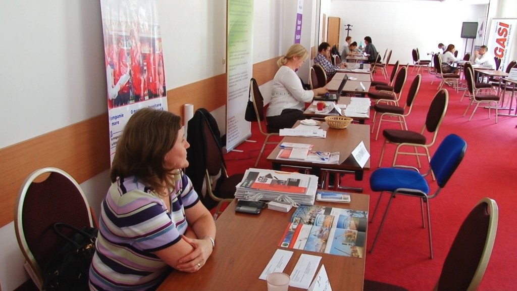 În cea de-a doua zi a târgului de joburi de la Centrul Regional de Afaceri, doar câțiva oameni au trecut pragul pentru a vedea oferta și a-și depune CV-ul. Posturile vacante se adresează atât persoanelor cu studii superioare, cât și celor cu studii medii sau muncitorilor necalificați. Zeci de firme din domeniul IT, construcții, instalații, logistic, automotive, comerț sunt prezente până joi la CRAFT. “Avem trei posturi: de ambalator manual, operator depozit și operator introducere validare și prelucrare a datelor. Ziua de ieri a fost cu candidați foarte puțini, în schimb astăzi a mers mult mai bine. În prezent am strâns unsprezece CV-uri”, spune Roxana Mihoni, reprezentant companie.