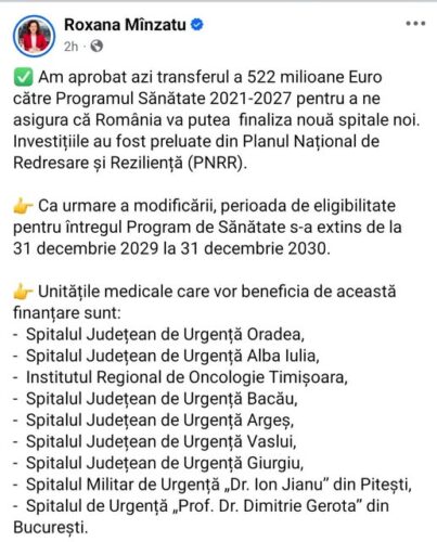 Edilul a anunțat că Roxana Mînzatu, comisar european pentru Drepturi sociale și competențe, a aprobat transferul a 522 de milioane de euro către Programul Sănătate, pentru finalizarea de către România a nouă spitale care erau incluse în PNRR inițial, IROT fiind unul dintre acestea.
