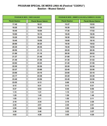 Societatea de Transport Public Timișoara prelungește, în perioada 29 – 31 august 2025, programul de circulație al autobuzelor de pe linia 46 (Bastion – Muzeul Satului), pentru a facilita accesul publicului la CODRU Festival.