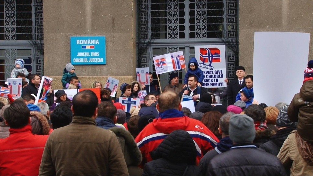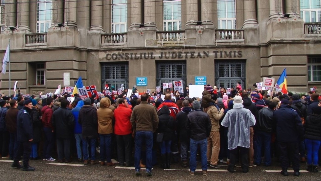 Sute de persoane au protestat, sâmbătă, în fața Prefecturii Județului Timiș! Mitingul de solidaritate vine după ce serviciile sociale norvegiene ar fi luat abuziv cei cinci copii ai familiei unui roman şi ar fi deschis procedura adopţiei internaţionale pentru ei.