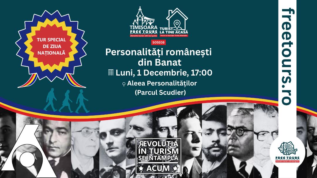 Cu ocazia Zilei Naționale a României, Asociația Turism Alternativ, prin proiectul Timișoara Free Tours, invită publicul la un tur ghidat special dedicat personalităților românești care au marcat istoria Banatului. Evenimentul va avea loc luni, 1 Decembrie, între orele 17:00 și 19:00, cu punctul de întâlnire la Aleea Personalităților din Parcul Scudier. Participarea este gratuită, iar înscrierea nu este necesară.