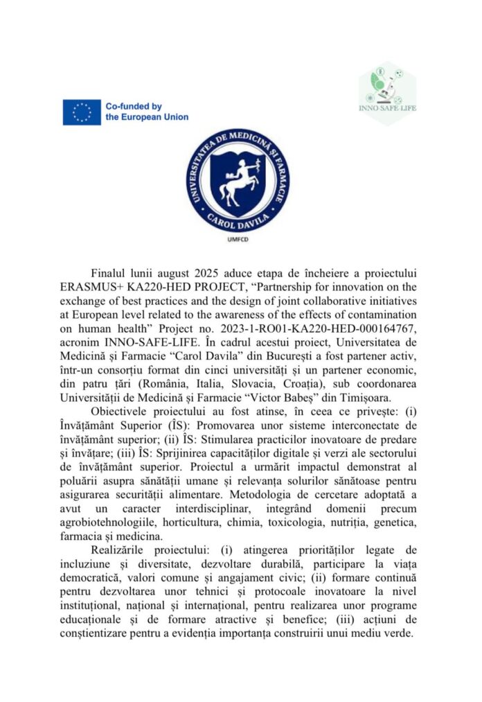 Finalul lunii august 2025 aduce etapa de încheiere a proiectului ERASMUS+ KA220-HED PROJECT, “Partnership for innovation on the exchange of best practices and the design of joint collaborative initiatives at European level related to the awareness of the effects of contamination on human health” Project no. 2023-1-RO01-KA220-HED-000164767, acronim INNO-SAFE-LIFE.