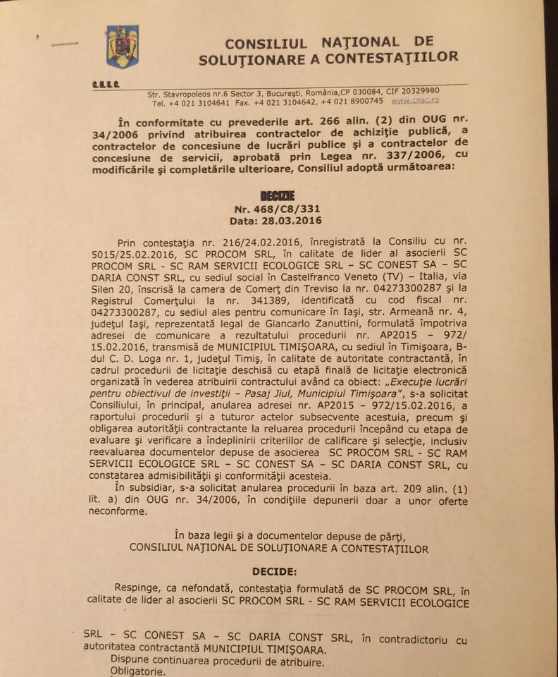 EI BINE, ASTĂZI AM PRIMIT DECIZIA CONSILIULUI NAȚIONAL DE SOLUȚIONARE A CONTESTAȚIILOR: CONTESTAȚIA BOICOTOARE A FOST RESPINSĂ! DECI, ASTĂZI AM SEMNAT CONTRACTUL CU FIRMA CÂȘTIGĂTOARE, REPUTATA COMPANIE AUSTRIACĂ SC PORR CONSTRUCT SRL!