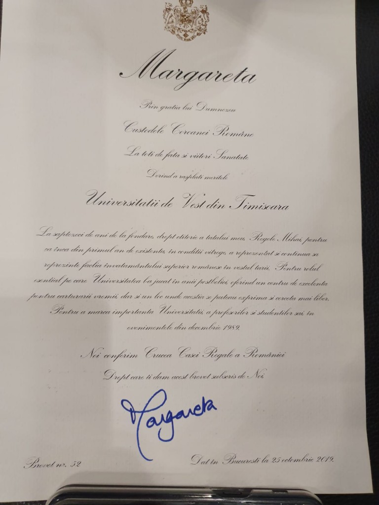 În fiecare an, pentru a marca ziua de naștere a Regelui Mihai, 25 octombrie, Majestatea Sa Margareta, Custodele Casei Regale a României, oferă decorații regale unor personalități și instituții din România. Anul acesta a venit și rândul Universității de Vest din Timișoara, care se află la cea de-a 75-a aniversare.